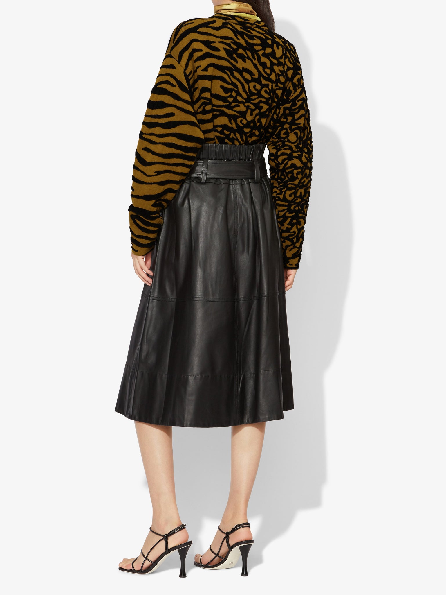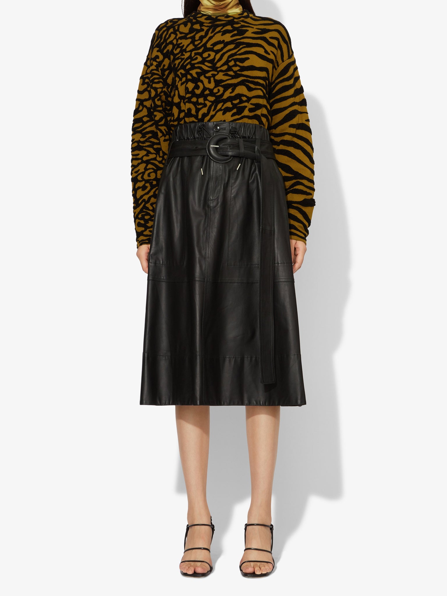 The Animal Jacquard Knit Pullover in brown and black is crafted in an oversized silhouette and features a mixed zebra and leopard jacquard knit. Dropped shoulders. Ribbed crewneck.
