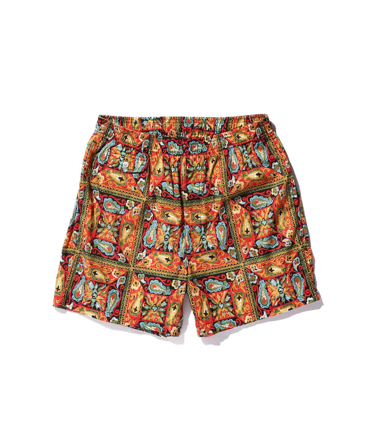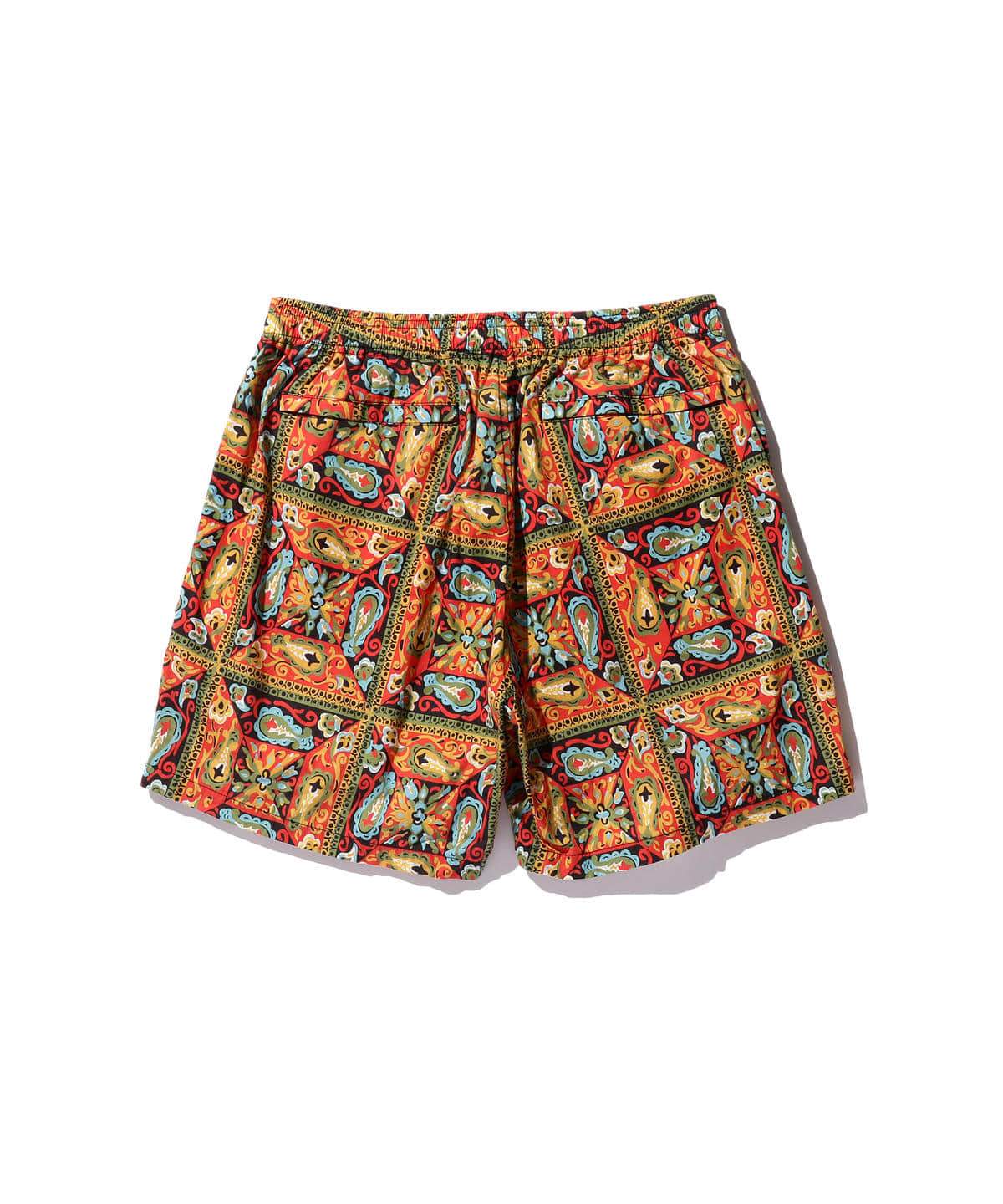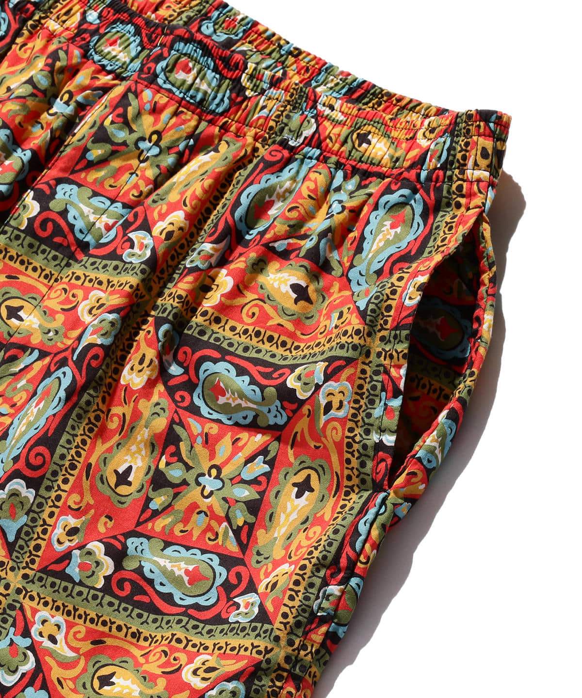 These BEAMS+ beach shorts are inspired by American swimwear designs from the 1960s. Modified for townwear, it is cut from a cotton-rayon batik print fabric that drapes nicely and is cool to the touch. Hidden drawstring waist. Available in three sizes.