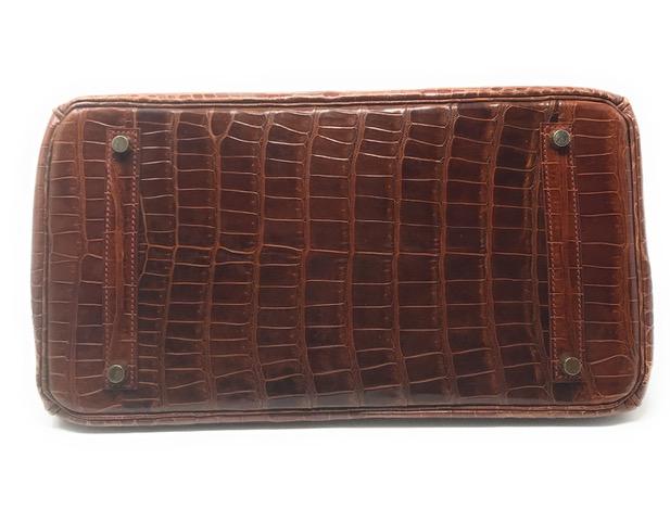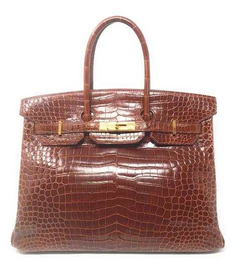 The king of exotics, demanding the highest prices on the market, is Hermes Porosus Crocodile farmed in Australia. It is characterized by a tiny pore on each scale hence its name. The Lisse (Shiny ) effect is achieved by arduous Agate stone polishing. Porosus crocodile is distinctly marked with a “ ^ “ ( inverted V ) next to the brand stamp. Porosus Crocodile is the skin used to craft this gorgeous Hermes Birkin bag in the 35cm size. It is accented with gold plated hardware featuring the Hermes signature turn lock closure making it a bold statement bag.