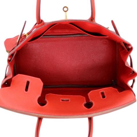 An intense red, this Hermes Birkin bag is the perfect pop of color to any ensemble. It is crafted in Togo leather with two rolled top handles and a flap closure. This is the 30cm size which is a compact size that can be enjoyed day or night. It is lined  tonal Chevre leather with one zippered pocket and one open pocket. This bag is luxuriously accented by gold plated hardware featuring the Hermes signature turn lock closure.