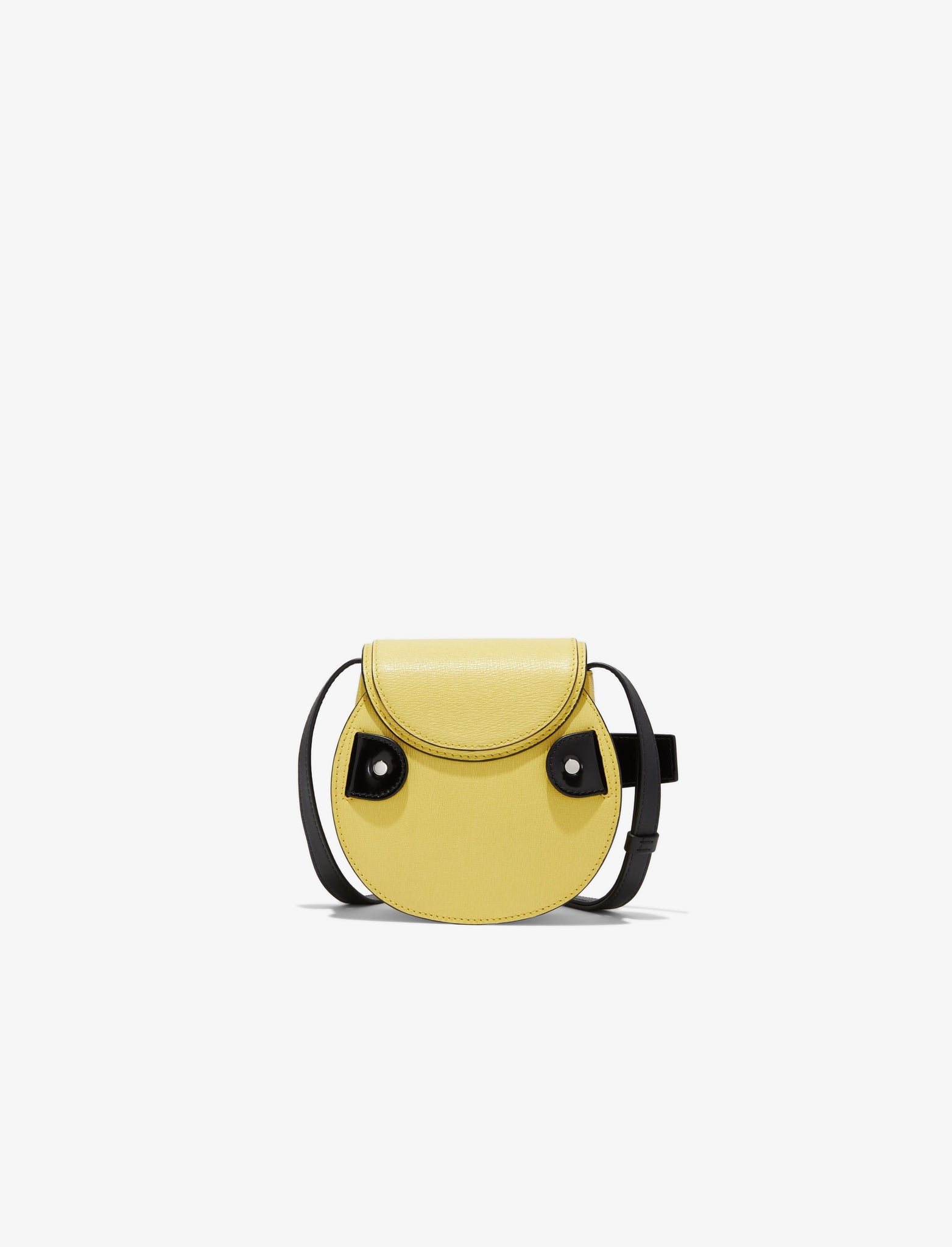 The Buckle Mini Crossbody Bag is defined by its structured round silhouette and custom-developed belt buckle hardware. Extended front flap closure secured with a polished black leather belt detail and a hidden magnetic closure. Adjustable shoulder strap. Signature dual-toned logo stamp in silver and gold. Interior leather patch pocket and suede lining.