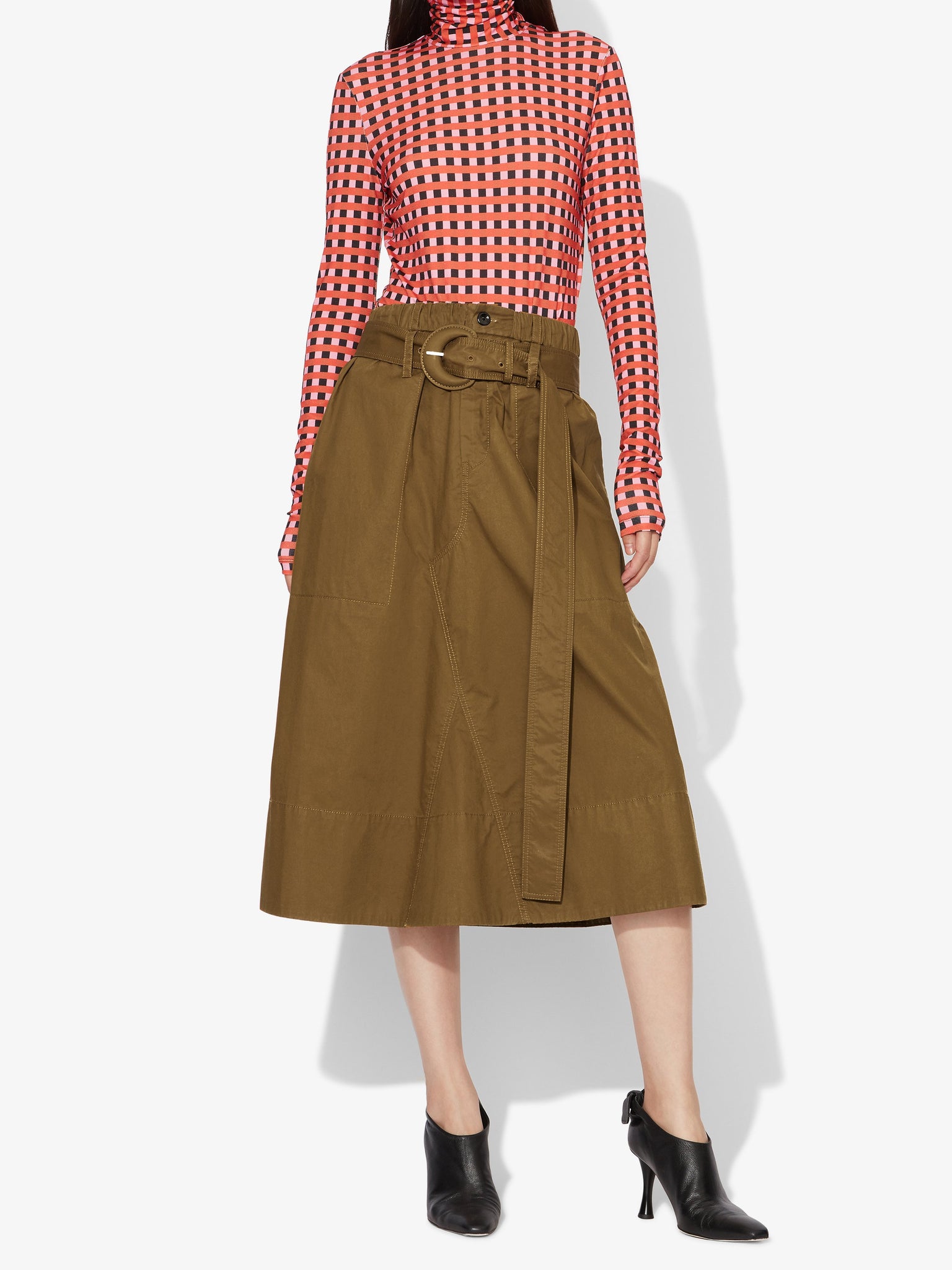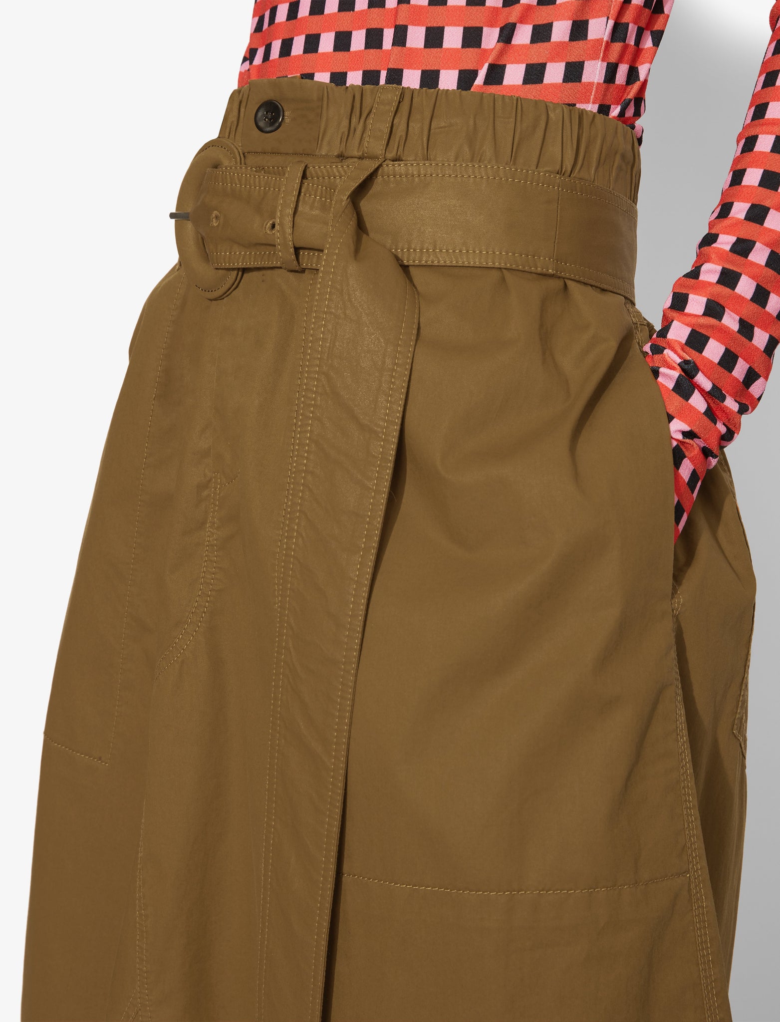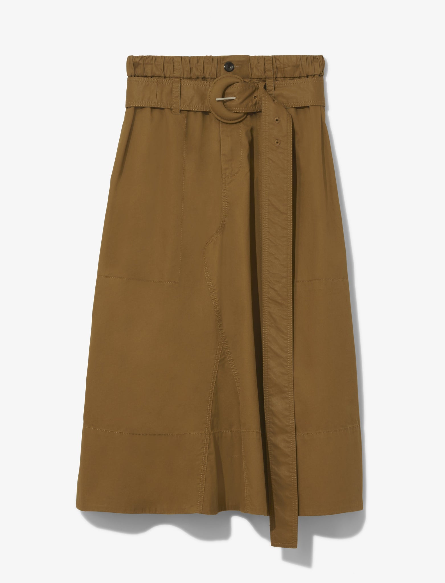 Crafted in cotton twill, the Belted Cotton Skirt in brown features a high-rise waist with a contrasting black drawstring and elongated self-covered buckle belt. A-line silhouette. Front button and concealed zip closure. Side slip pockets.