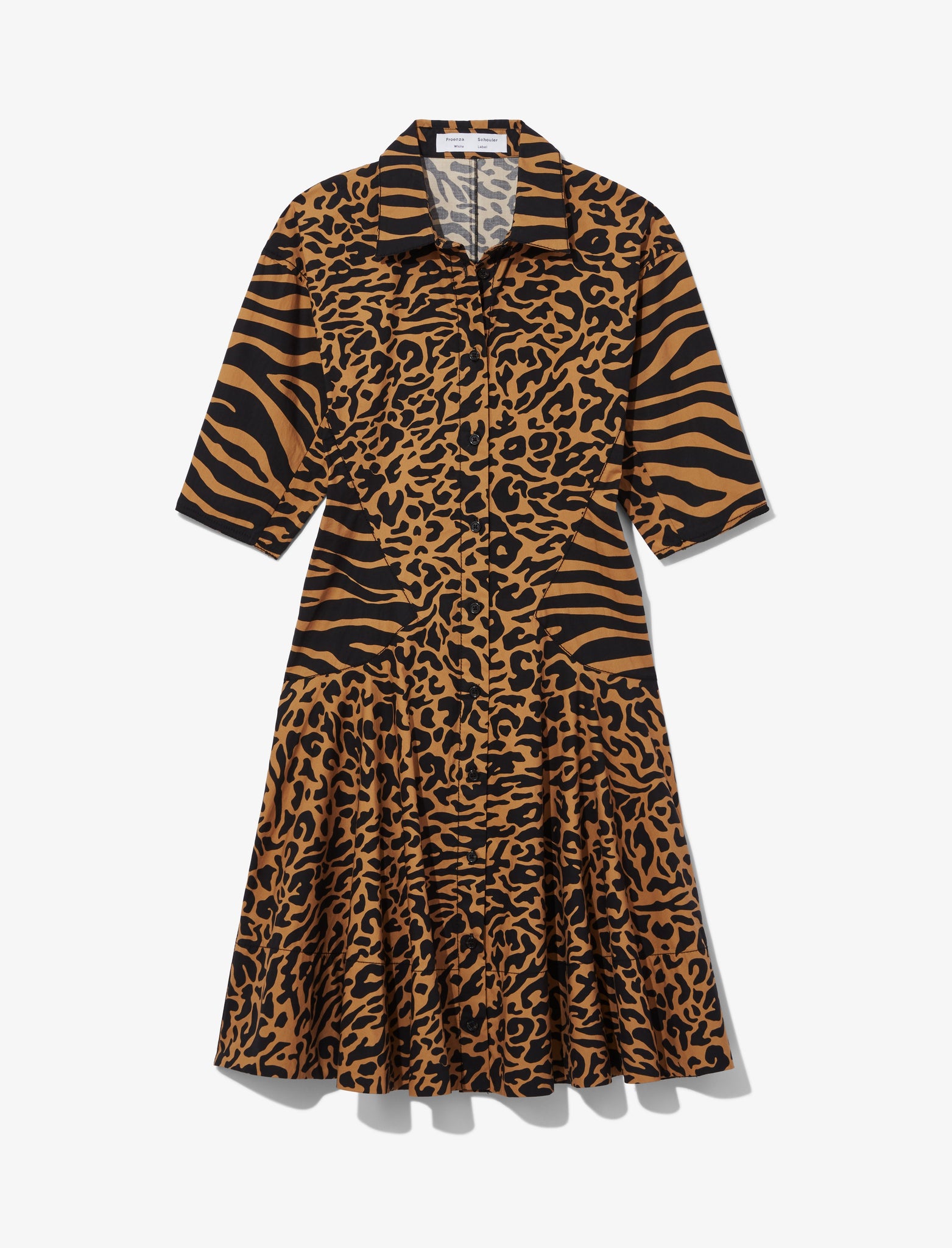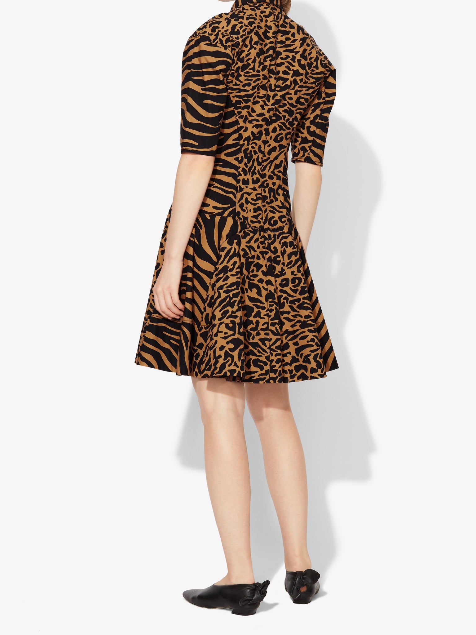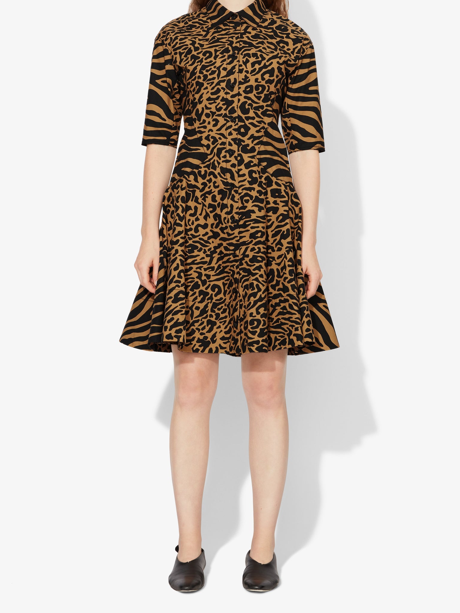 The black and orange Animal Print Cotton Short Sleeve Shirt Dress is cut from leopard and zebra printed cotton poplin and features a paneled, fitted waist. Short flared skirt. Slim mid-length sleeves. Center front button placket. Falls above the knee.
