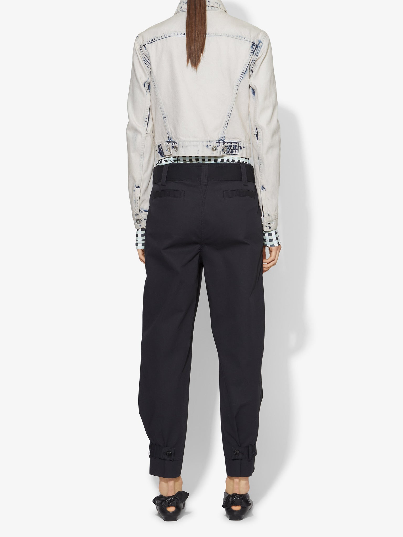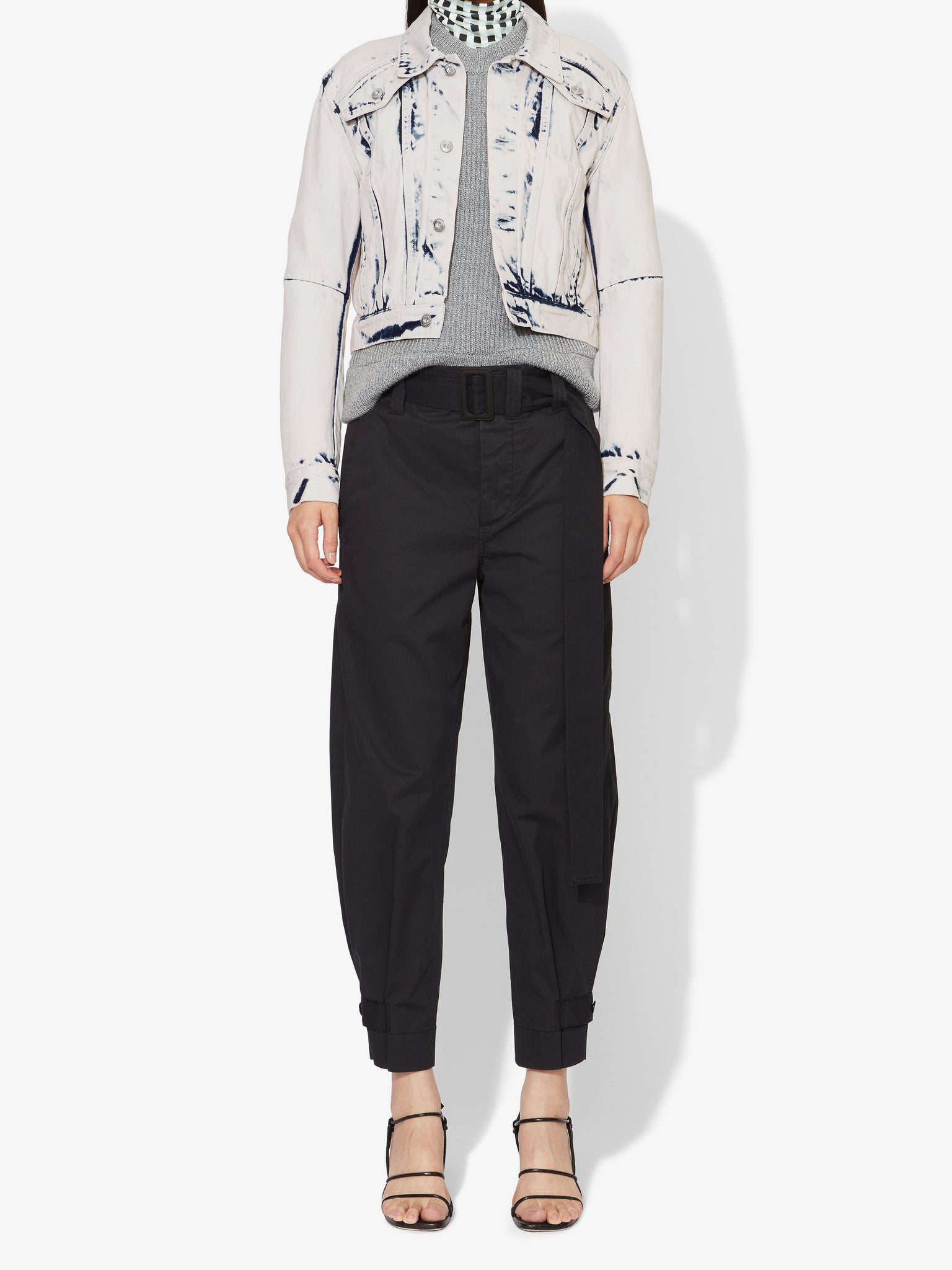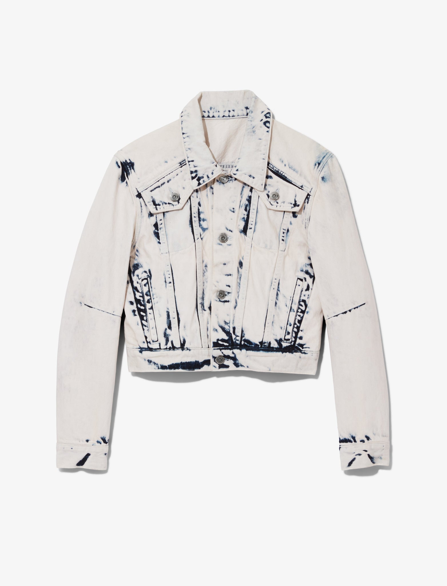 The white Bleached Cropped Jacket is crafted in bleached rigid denim and features a cropped length. Center front closure with silver-tone logo-engraved buttons. Point collar. Chest flap pockets. Side slip pockets. Buttoned cuffs. Side waist tabs.