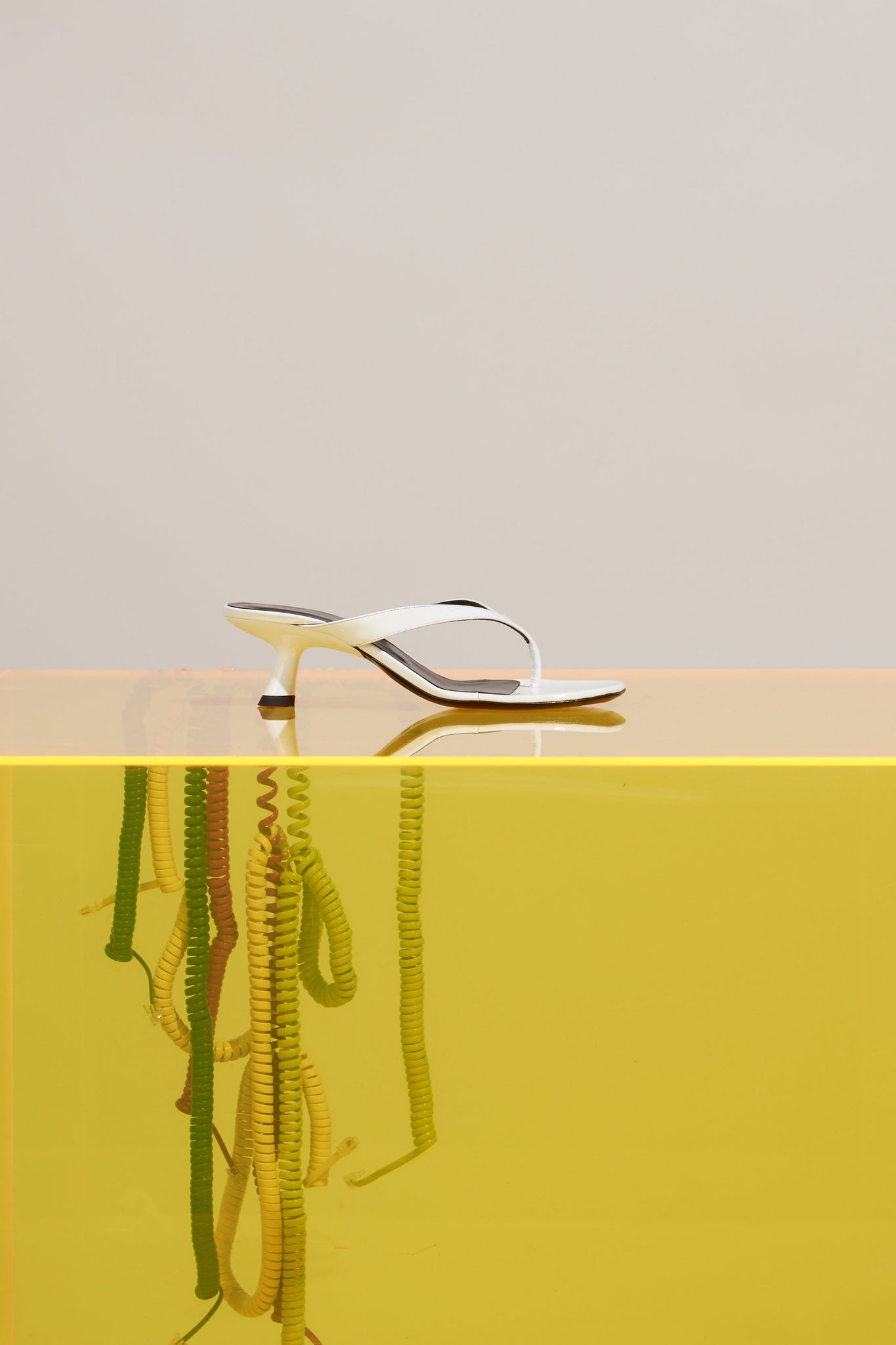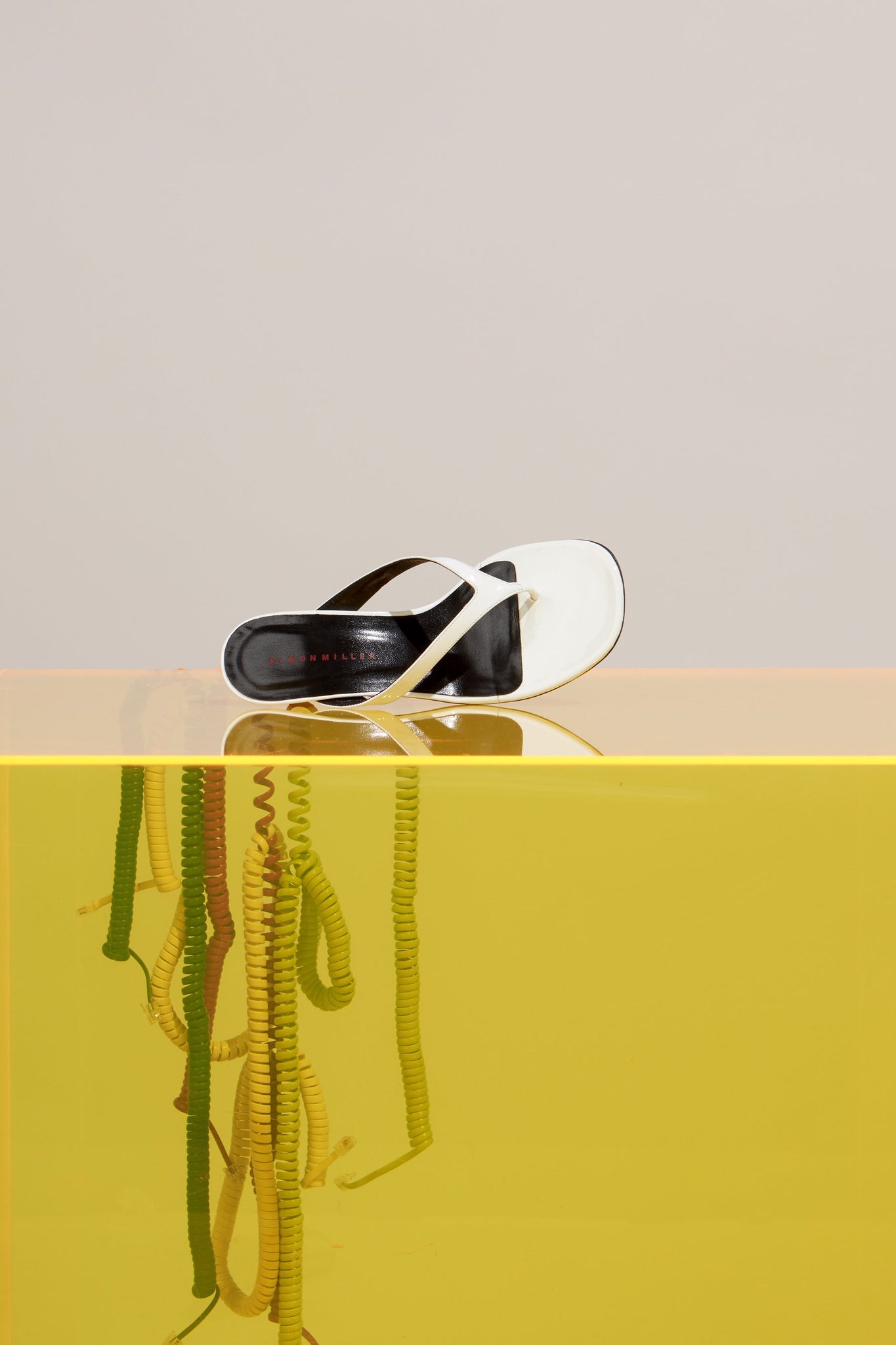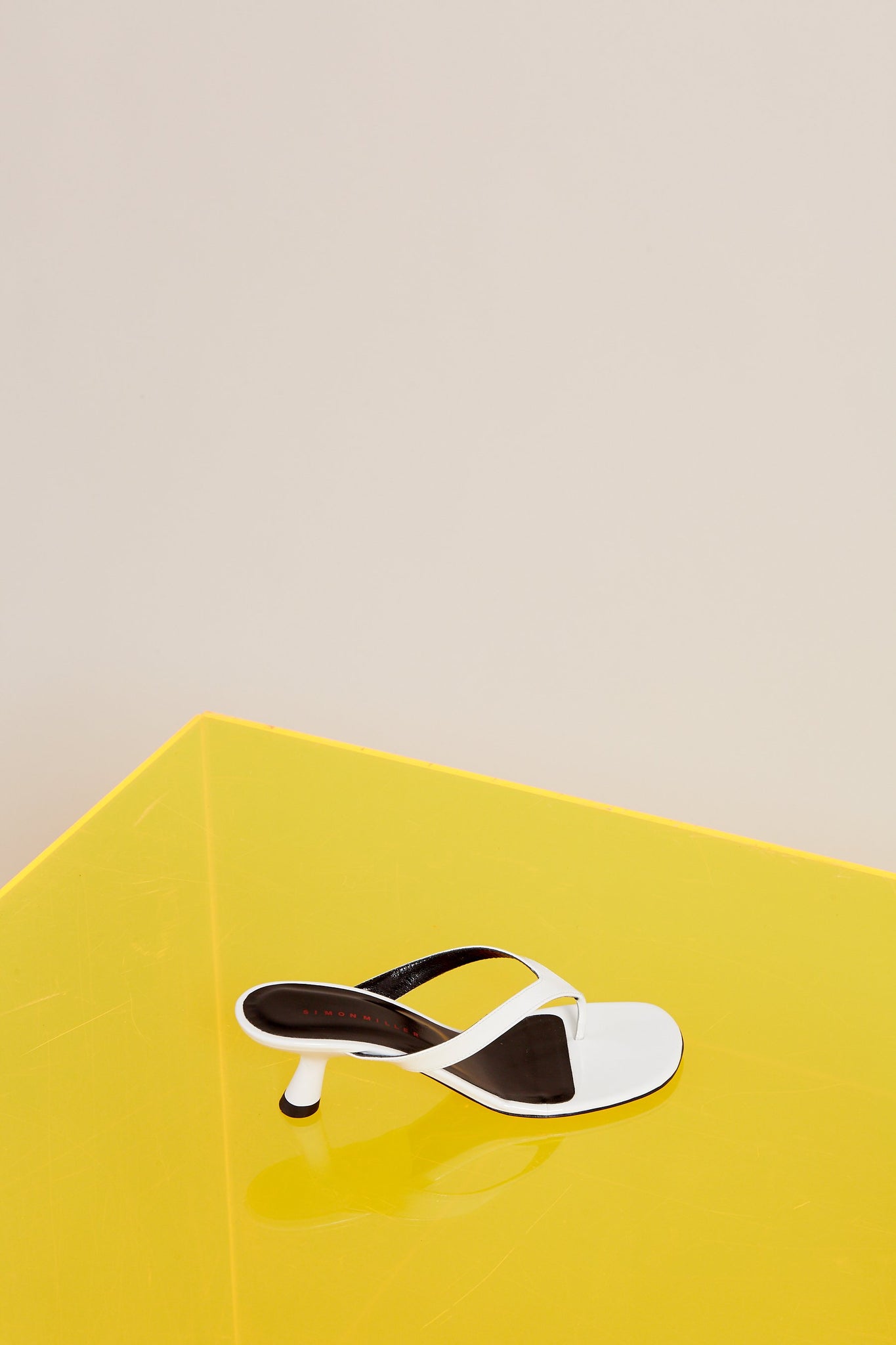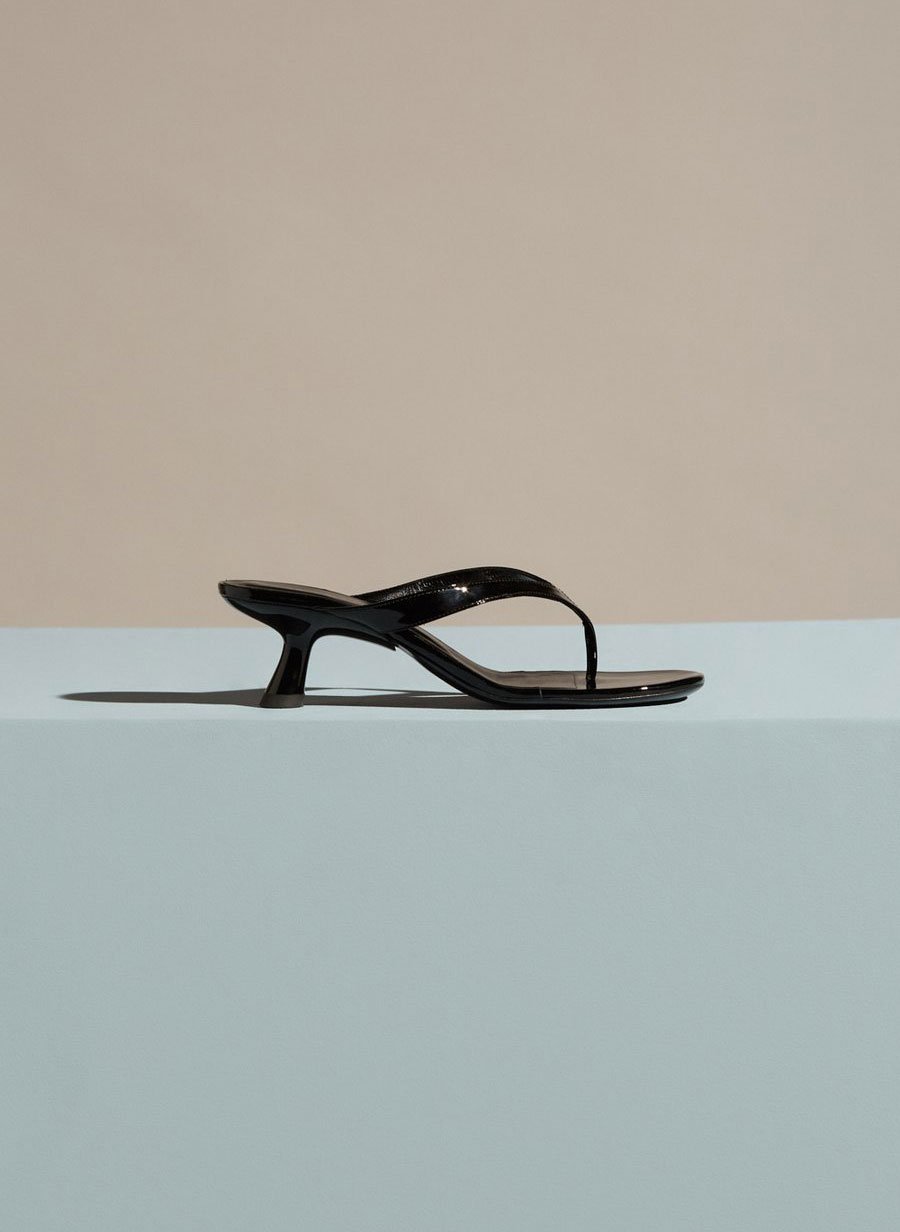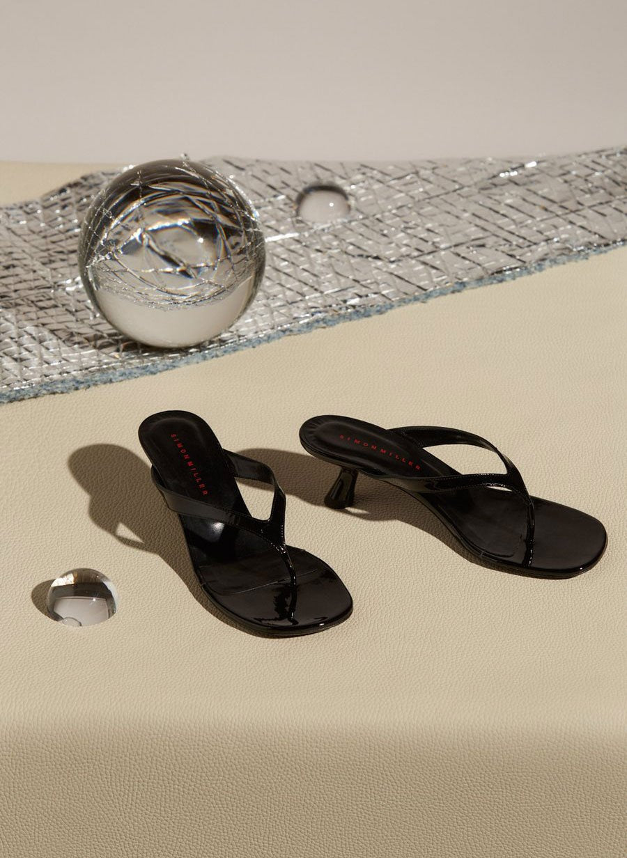 Beep Thong by Simon Miller. Heeled open toe thong sandal with black patent leather upper and black 45mm heel. Slides on. Fits true to size. European sizing.
