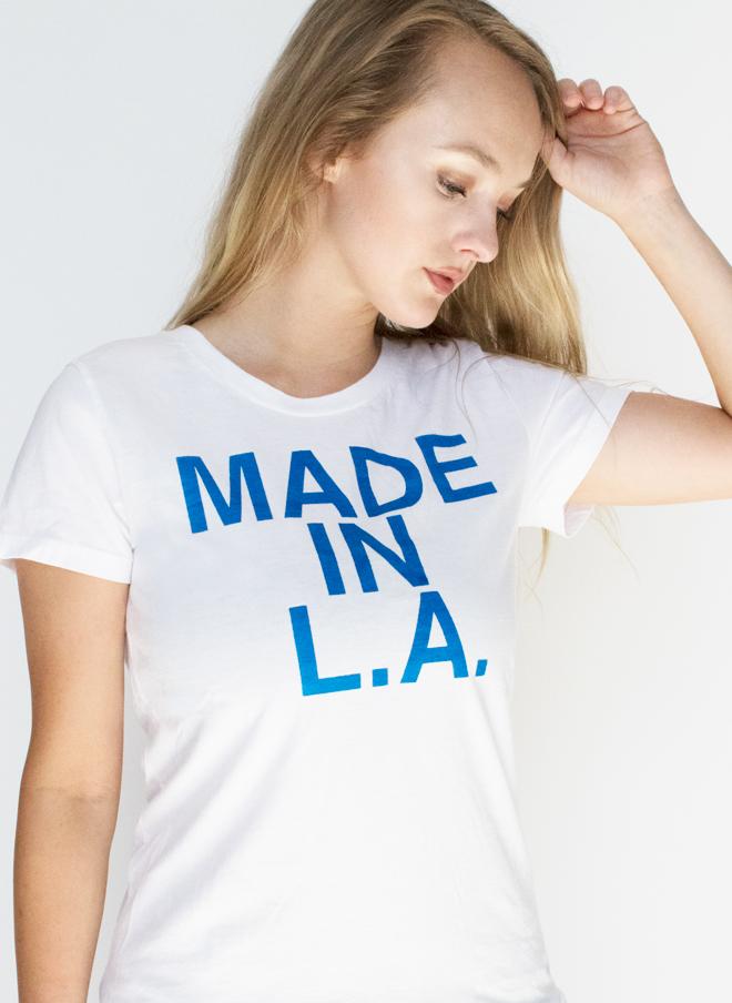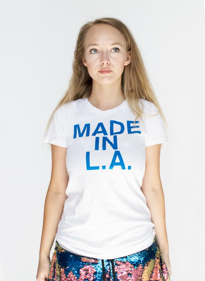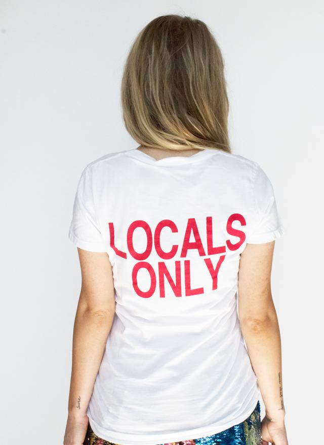 Hand-printed graphic tee by Libertine. Short sleeve. MADE IN LA graphic at front. LOCALS ONLY graphic at back. Ribbed crew neck. Waist length. Unisex.
