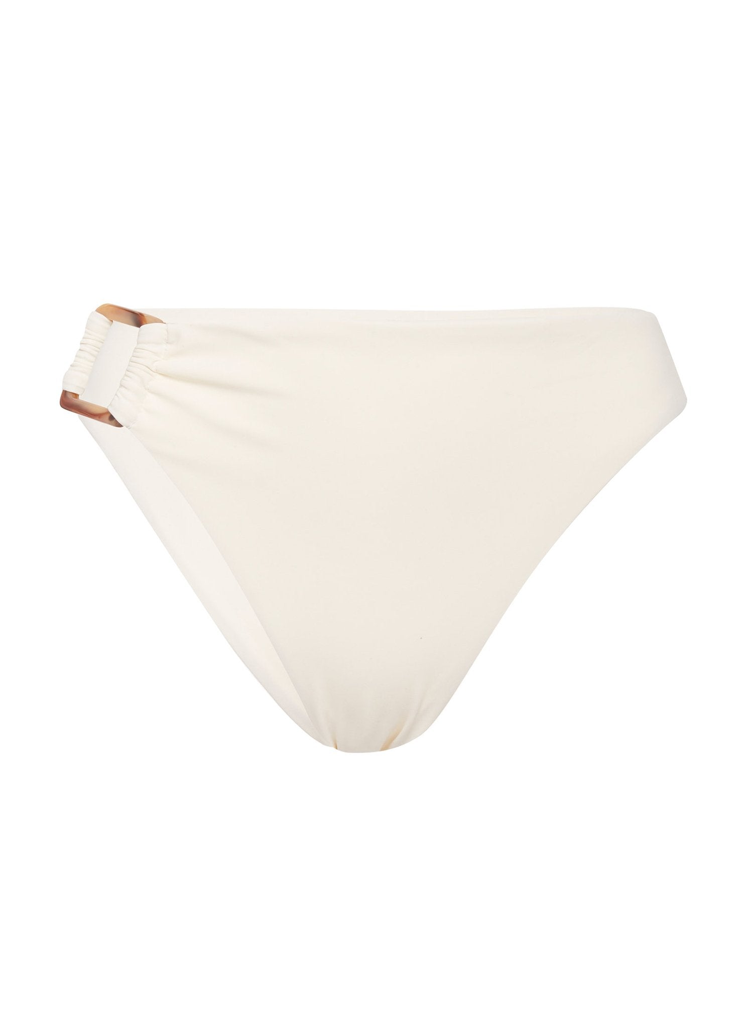 Our Asymmetric Tortoise High Waisted Cheeky Bottom is designed with a square "tortoise shell" resin ring in our signature rectangular shape. It is cut high in the leg giving it the perfect retro fit and also features our signature cheeky bottom.