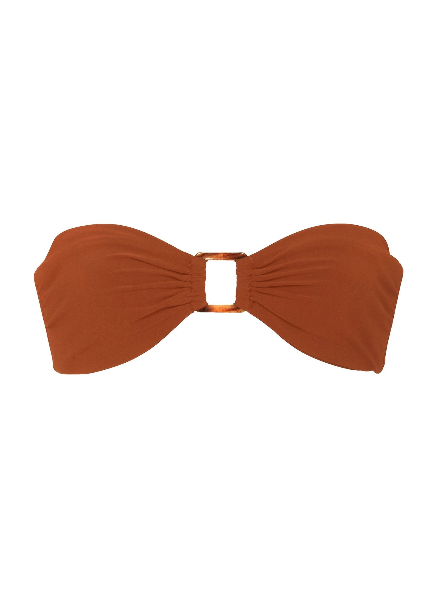 Our Tortoise Ring Bandeau top is inspired by the retro glamour of the '70s balanced with the simplicity of '90s design. The style is designed with a resin tortoise ring in a signature square shape, it has boning at the side for support, and is fastened with a hook and eye closure.